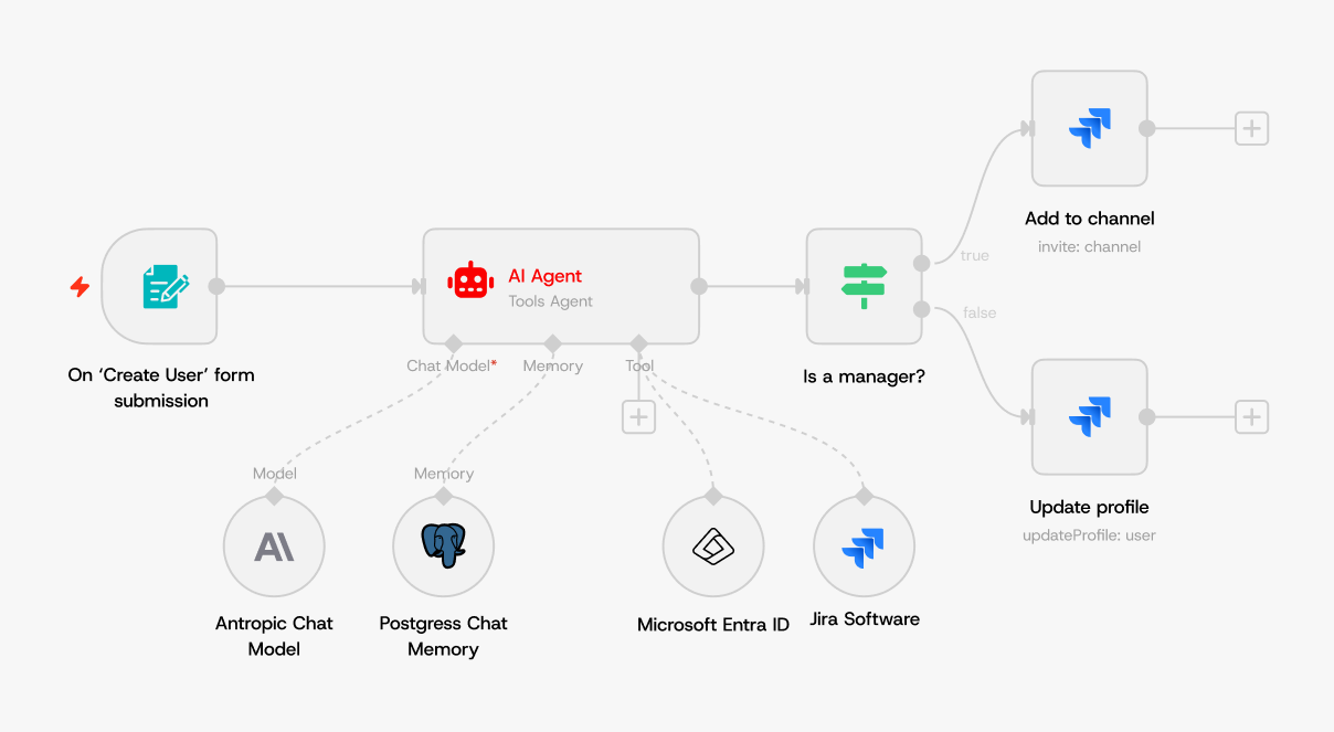 Сценарии в n8n собираются из отдельных узлов (нод), где каждая нода выполняет конкретную функцию — например, принимает сообщение, извлекает данные, обращается к AI-модели или создаёт задачу в Jira. Соединяя такие ноды между собой, можно выстраивать процессы практически любой сложности.
